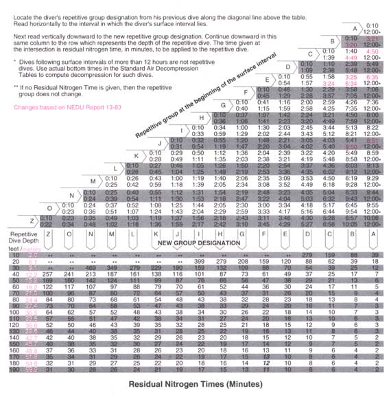 US Navy No-Decompression Limtis and Repetitive Group Designation Table 0 - 300 m